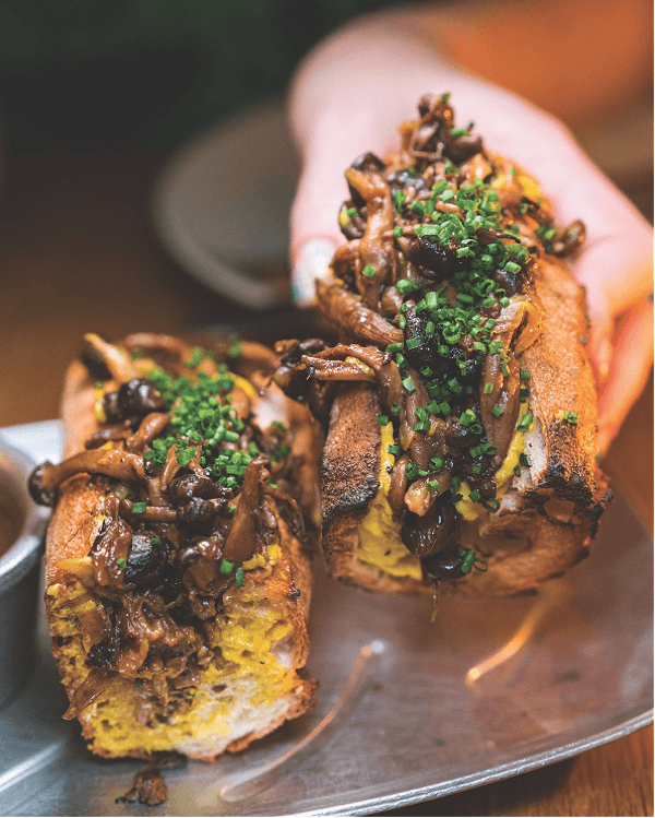 Photo Credit: Eszett The plant-based Mushroom “French” Dip Sandwich, menued at Eszett in Los Angeles, switches out the classic sandwich’s beef with confit mushrooms and layers on caramelized cabbage and onion plus a garlic spread; it is served on a baguette with burnt leek au jus.