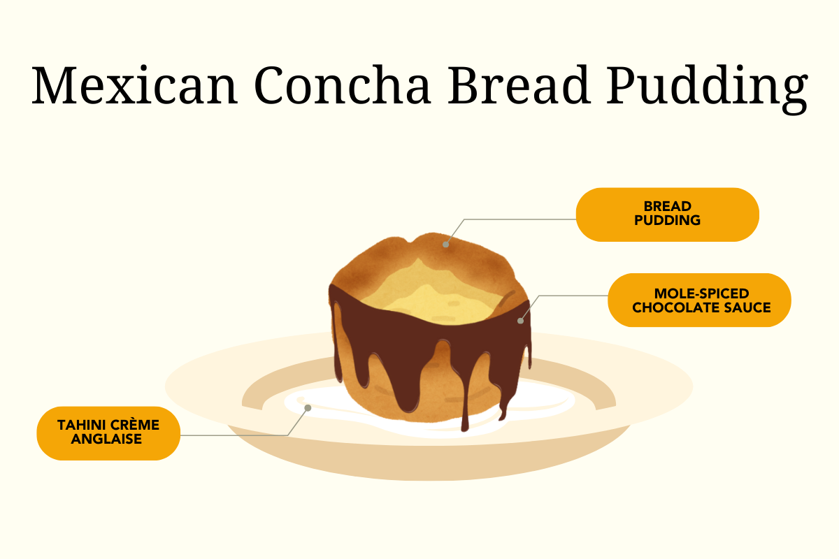 Sweet: Mexican Concha Bread Pudding, drizzled with mole-spiced chocolate sauce and served atop a swoosh of tahini crème anglaise