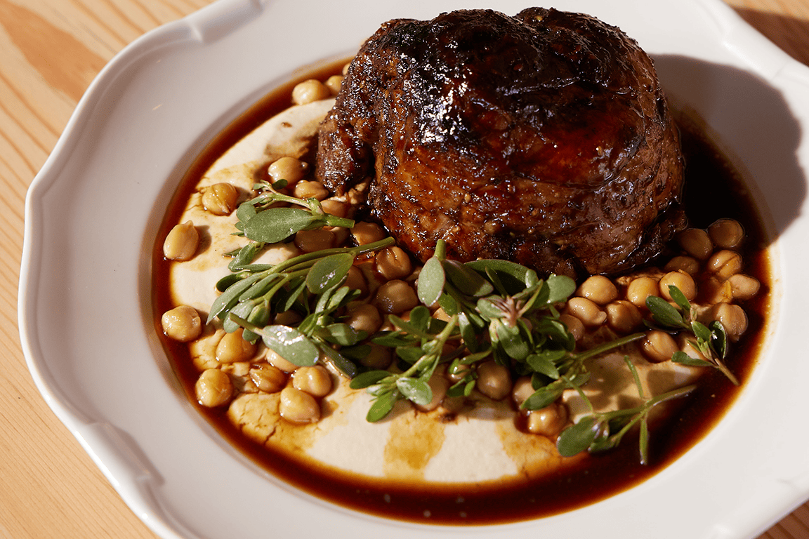 Photo Credit: Isabel Baer Dalida’s Cypriot Lamb Chops were inspired by Cyprus’ sheftalia, a crépinette that’s encased in caul fat. At the restaurant, they use both caul fat and seasoned ground lamb to encase the chops before grilling, then serve them over hummus with lamb jus and chives. “The beautiful fat melts into the lamb chops, adding rich flavor,” says Ozyilmaz. “It feels like you’re eating a kebab on the street, but it’s elevated. We’re really proud of this dish. It’s delicious and showcases a technique that’s not often seen on menus here.”