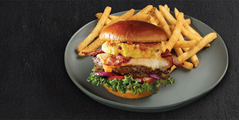 TGI Fridays TGI Fridays moves the omelette into one of America’s favorite handhelds. Its Cheddar Bacon Omelette Burger stars an omelette perched atop a burger patty, along with white cheddar, aged all-natural cheddar spread, tomato, red onion, pickles, hickory-smoked bacon and Fridays sauce.