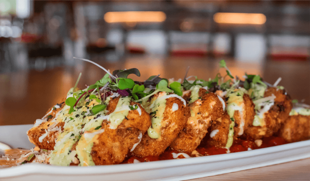 Photo credit: Evviva Trattoria Evviva Trattoria turns lasagna into a shareable appetizer with its popular Crispy Lasagna Fritters. Thick slices of lasagna are breaded and fried, then laid atop marinara sauce. Pesto ranch, arrabiatta aïoli, whipped ricotta and microgreens finish the dish.
