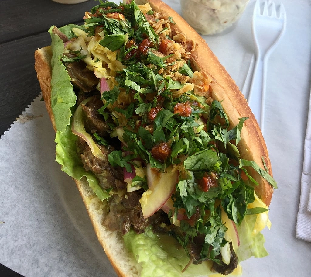 Given the requisite herbs and veggies, the bánh mì is a great starting place for global chopped sandwiches. KoKyu doubles down on the greens and chops them extra fine for a salad-like sando.