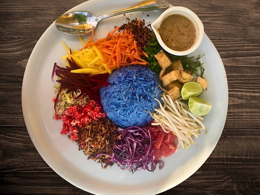 Sugar & Spice’s deconstructed Vegan Kow Yum salad is not only visually striking but also interactive, inviting guests to toss the various components in a dark herb vinaigrette for a combination of crunchy textures and bright flavors.