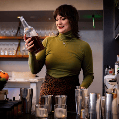 “We steep blue butterfly pea tea, which is a pH-sensitive tea, and then freeze it into a cube,” says Jolley. Tequila is shaken with chile liqueur, lime juice and agave, along with fresh basil. “The cocktail is poured tableside, and when the acidity of the lime juice touches the tea ice cube, it changes color from blue to purple.” Not only are guests captivated by the color show, but the aromatic tea lends bitter notes that blend well with the spicy, herbaceous and slightly sweet flavors of the other ingredients. “It’s a balanced margarita with a hint of earthiness,” says Jolley.