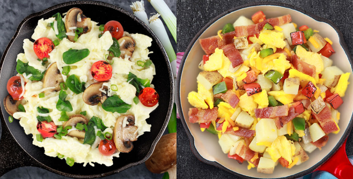 - Classic American Scramble: Whole egg curds, bacon, potatoes, cheddar cheese, roasted red and green bell peppers, and red onions
