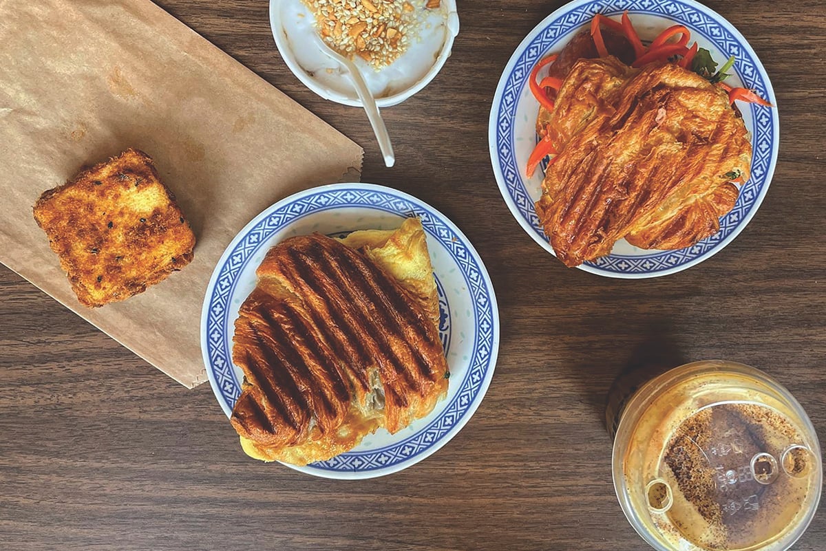 Credit: Hello Em Hello Em Viet Coffee & Roastery in Seattle is doing its part to propel a movement around pressed-and-grilled croissant sandwiches. Of particular note is its Croissant Pâté, a pillowy soft croissant that is cut open, filled with bone marrow pâté, an omelette, mayo, scallion oil and fried shallots, and then pressed, melding the flavors and activating the butter in the croissant to reveal its crispy, crackly deliciousness.