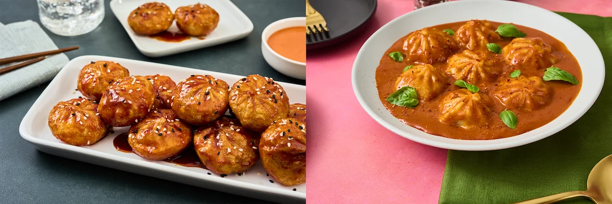 Fried or steamed, bibigo™ Chicken & Vegetable Steamed Dumplings deliver craveable flavor. At right, a surprising Korean-Italian fusion emerges when the steamed dumplings are served in an unexpected gochujang-rosé sauce.