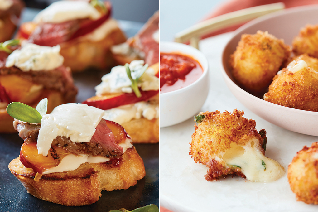 Beverage pairing suggestions take into consideration the flavor notes of a broad range of specialty cheeses that anchor the Aperitivo program. A decadent Gorgonzola Steak Crostini (left) pairs well with a Tom Collins, hard cider or Barolo, while craveable Breaded Crescenza Fontina (right) is complemented by an Old Fashioned, a fruit beer or red zinfandel.
