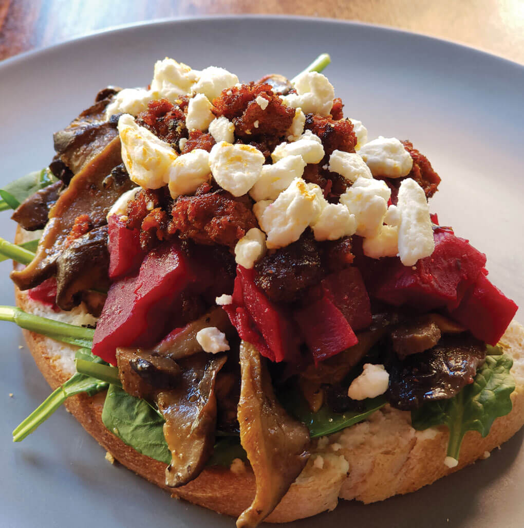 Banksia The Mushroom & Beet Toast served at Banksia in Kansas City, Mo., tops pain levain with ricotta, slow-cooked mushrooms, roasted beet relish, English spinach and goat cheese.