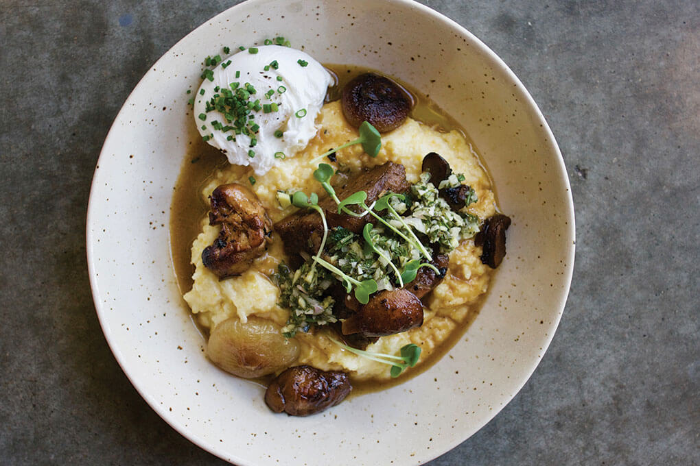 Meat-centric dishes that look beyond the usual suspects also play in this space, pointing to the country’s strong culture around raising both cattle and sheep, but also its determination to keep comfort in the crosshairs. St. Kilda introduced a Beef & Polenta dish onto its daytime menu as a special a while back, and thanks to rave reviews, it made it onto the fall/winter menu. It features slow-braised chuck roast, cooked in red wine, beef stock and aromatics, served with creamy polenta, cipollini onions, local mushrooms, gremolata and a poached egg. “It is a delicious dish that is comforting and filling. Our guests look for unique options for breakfast and this is a favorite,” says Whitney Hall, owner.