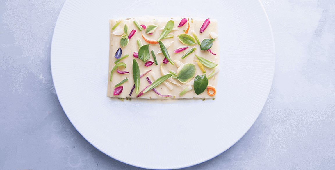 - To serve, gently warm and dress a perfectly cooked sheet of lasagne with the beurre monté. Fold the sheet to fit the plate and sauce the sheet again.