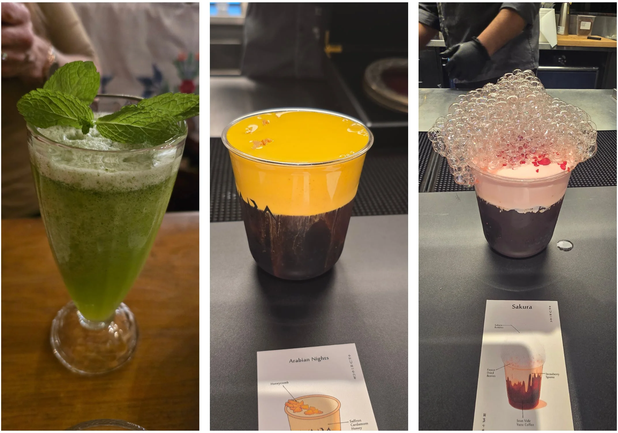 Credit: Jaclyn Oyola Dubai is a rich source of non-alcoholic beverage inspiration. The Arabic mint lemonade (left) at Al Khyma Restaurant offered a refreshing accompaniment, while Yaba Coffee Lab showcased a menu of standout coffee creations built on a sous-vide coffee base—including the Arabian Nights, topped with saffron-cardamom-honey foam, and the Sakura, finished with sakura bubbles, freeze-dried berries and strawberry spuma over sous-vide yuzu coffee.