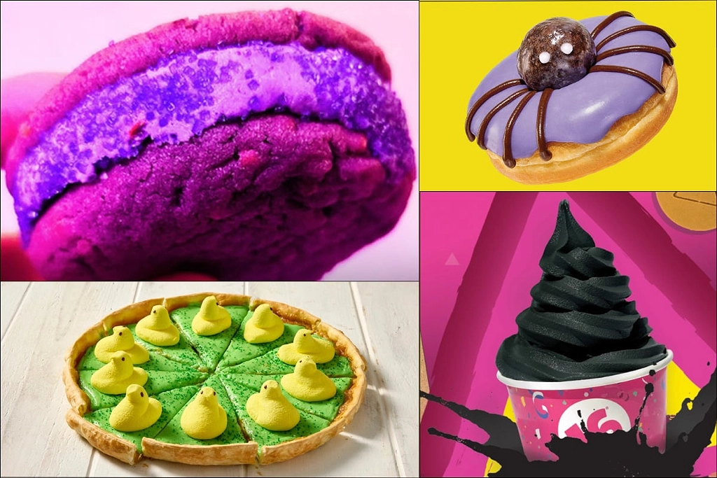 The menu color cycle of the moment features attention-grabbing neons, like the electric green and sunny yellows of Pizza Inn’s promotional Peeps Pizzert. The dessert pie celebrated springtime and Easter with 10 Peeps atop colored sugar crystals on a bed of Bavarian cream.