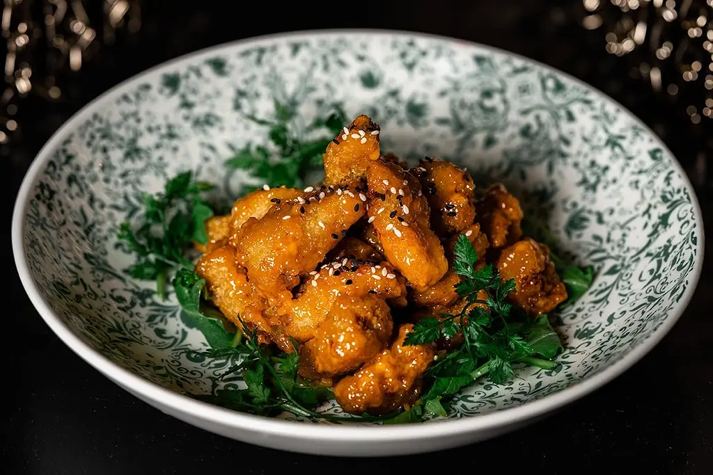 The hearty texture and umami-rich, seafood-like flavor of lion’s mane mushrooms make it an ideal stand-in for shrimp in The Chapman’s Crispy Bang Bang appetizer, which is spiced up with ssamjang-chile aïoli.
