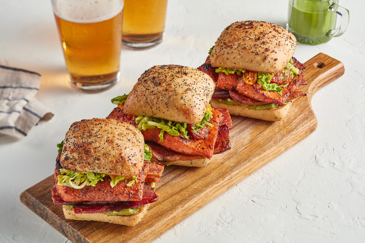 - Place 4 halves of bacon on the bottom of each roll. Place a portion of blackened salmon on top.