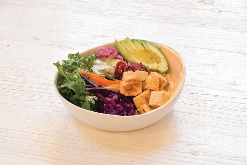 Modern and appealing, the Banh Mi Bowl at LB Kitchen in Portland, Maine, ensures each element punches with developed flavor, from the miso slaw to the “secret marinade” tofu.