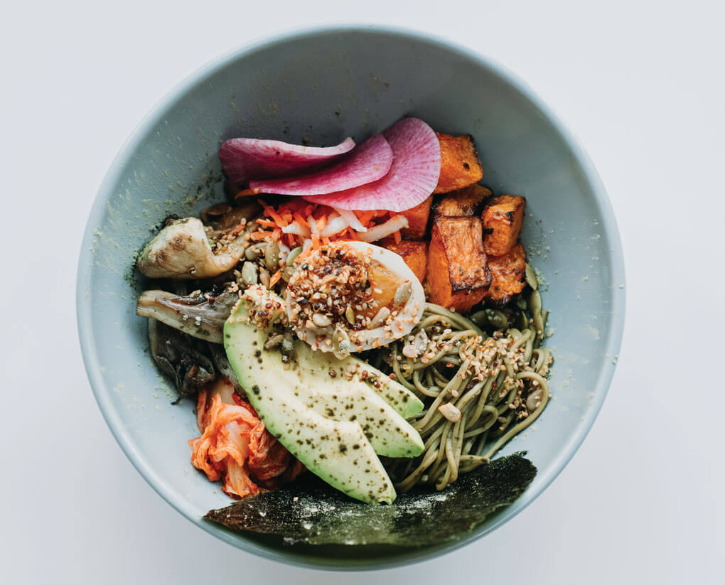 Victor of Valencia The Green Tea Power Soba Bowl at Denver’s Linger leads with assertive profiles like garlic-chile oil, brined watermelon radish, kimchi, ribbons of nori and a sesame-tamari vinaigrette.
