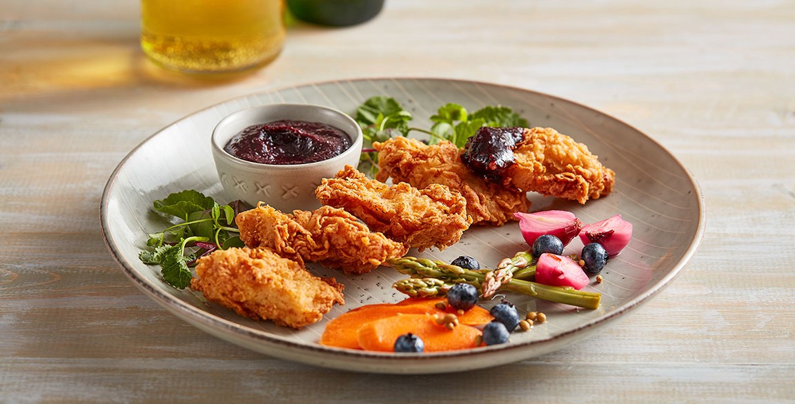 Chef Olivier Gaupin chose canned blueberries as the star of the Blueberry Barbecue Sauce accompanying the Buttermilk Fried Chicken Nuggets. “They bring a recognizable flavor that settles the smokiness of the sauce,” he says.