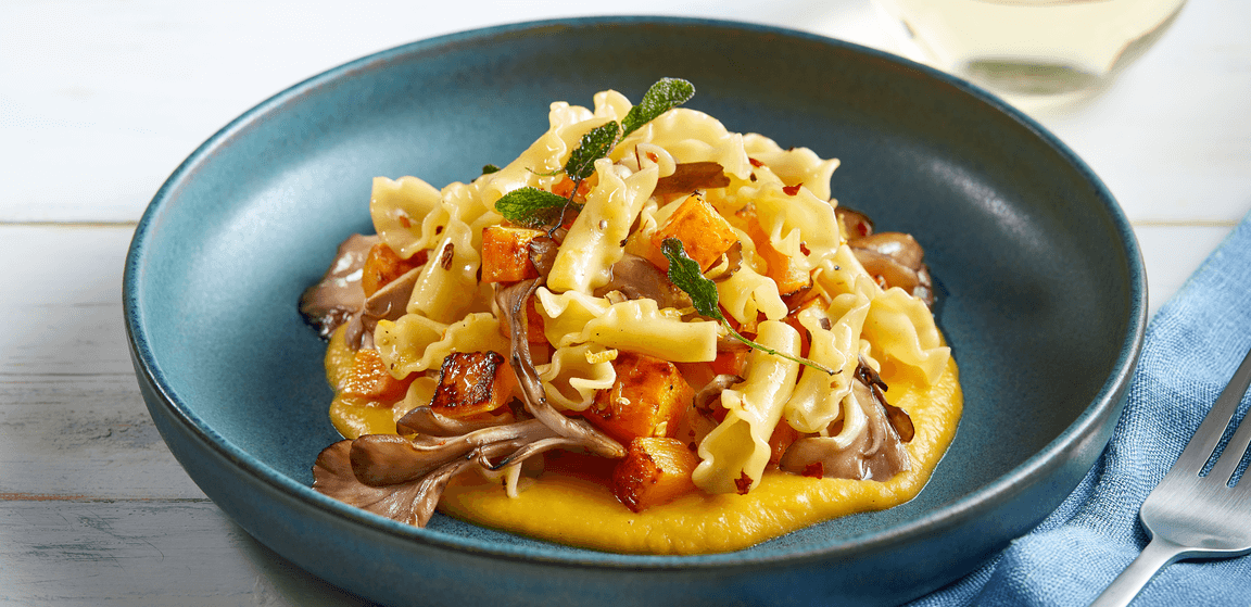 Campanelle Pasta with Butternut Squash, Maitake Mushrooms, Sage & Chiles