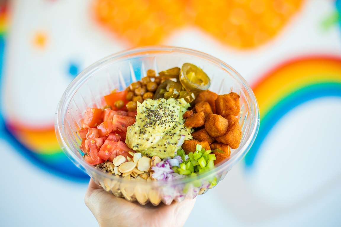 Toland uses candied jalapeños in two distinct menu items. The Shaka Spark Burger features a 4-oz. beef patty, Swiss cheese, spiced pineapple, lettuce and candied jalapeños, with a “Hang Loose” sauce similar to a teriyaki barbecue sauce. He also features the candied jalapeños (essentially pickled jalapeños sweetened with simple syrup) in the Spark Power Bowl, where a base of quinoa and couscous is tossed in lemon juice and topped with crispy chickpeas, red onion, tomato, almonds, chia seeds and a dollop of avocado hummus.