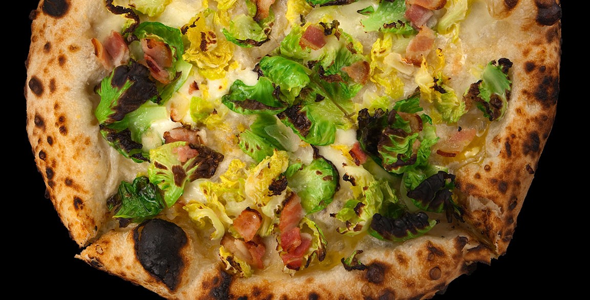 A chargrilled round of puffy flatbread offers up bold flavors, combining crispy bacon with chai-roasted Brussels sprouts.