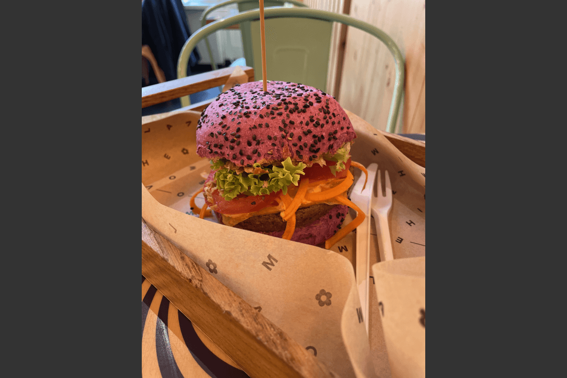 Flower Burger, a plant-based burger chain based in Milan, has tapped into the colored bun trend using plant-derived colors. We sampled a unique offering called the Smoky Butterfly, featuring a mushroom patty, lettuce, tomato, spiralized carrots, Flower “cheddar,” crunchy onions and smoky sauce. The bun gets its fuschia hue from cherry and beet extracts. With a rainbow of bun colors—including violet (from purple carrot extract), yellow (from turmeric) and a vibrant green (a blend of blue spirulina powder and yellow turmeric)—the colorful handhelds are a major driver behind the brand’s strong appeal among younger consumers, and the color sources support its menu of plant-based offerings.