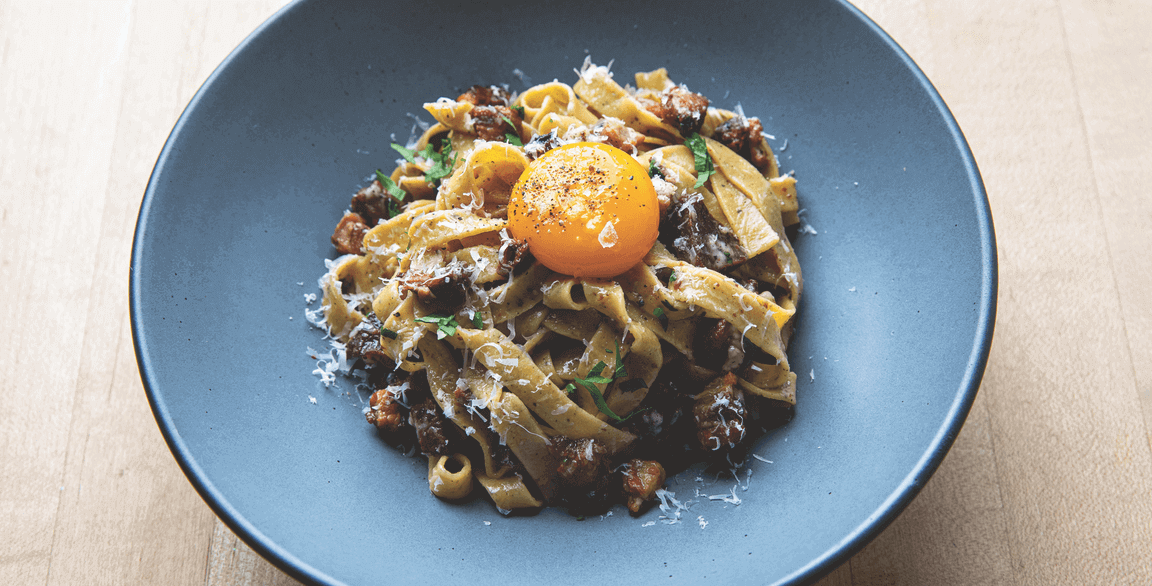 Tagliatelle with pork tesa, black pepper, egg, chives and Parmesan