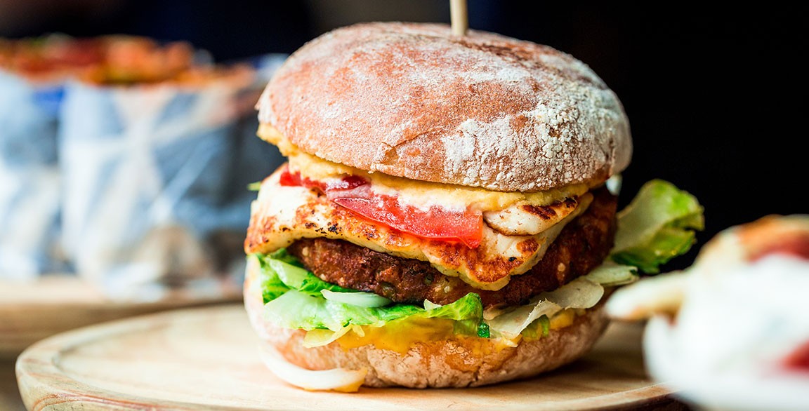 A classic American comfort food, the burger bends toward the Eastern Med with grilled halloumi and a cumin and paprika seasoned patty.