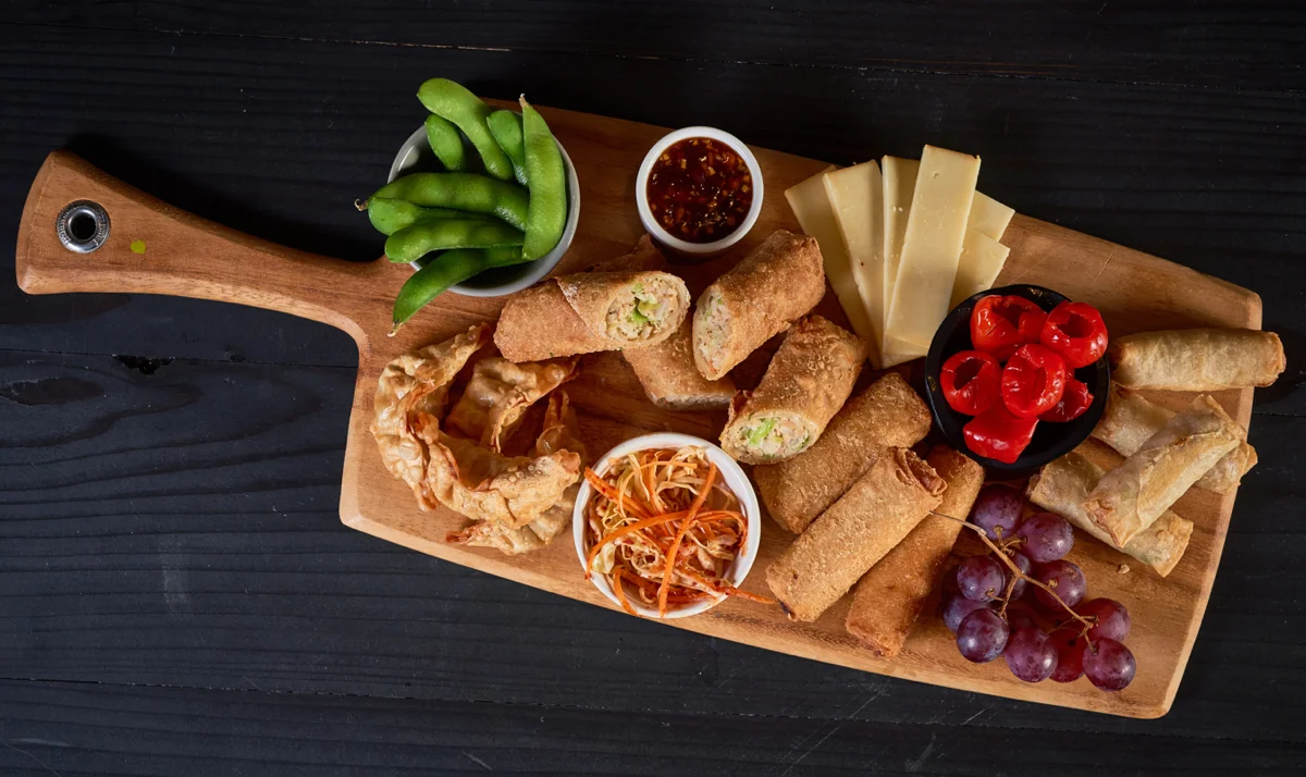 A charcuterie-style board featuring crispy egg rolls, spring rolls and dumplings is an unconventional presentation for a coveted shareable dining experience.