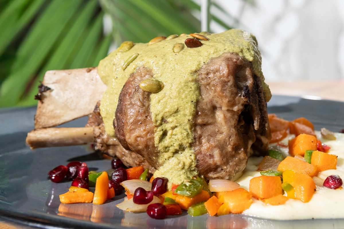 Patita Pibil: Tender pork shank marinated in traditional cochinita pibil seasoning, garnished with pomegranate arils and pepitas; served with Cotija cheese polenta, zucchini and yellow squash