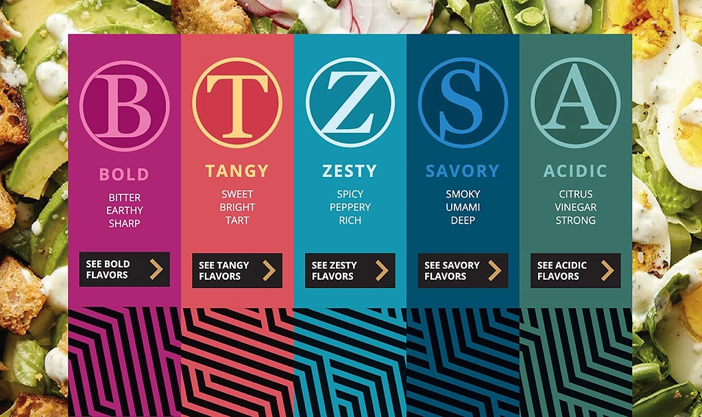 Whether you want to refresh your own flavor knowledge or help kitchen—and even marketing—team members better understand the implications and opportunities of different ingredient pairings, start by visiting Girard’s website to explore its flavor profile matrix. The brand has categorized its extensive portfolio of dressings, sauces, vinaigrettes and mayonnaises into five different “flavor buckets”: Bold, Tangy, Zesty, Savory, Acidic. Each flavor profile features a brief description, along with suggestions for ingredient pairings that balance or enhance key flavor characteristics. Products from Girard’s that fit the category are identified with a high-definition photograph that allows users to see ingredient particulates, as if they were looking at a sample in their hands.