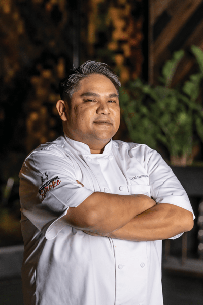 Foronda begins by curing the wings with salt, sugar and jerk seasoning. “The process allows the jerk flavors to go deeper into the duck.” But he says that the real star of the dish is a mango-habanero glaze that balances the fiery jerk flavor. The wings are served with “green seasoning,” a proprietary herb purée he characterizes as clean and herbaceous. “It creates a palate cleanser between bites of the juicy, sweet and spicy duck wings,” says Foronda. “The dish sells well— there’s no other like it.”