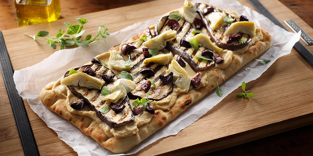 Credit: Stonefire® 12”x6” Original Flatbread A quality flatbread can be the proper showcase to allow ingredients like hummus and eggplant to work their flavor magic.