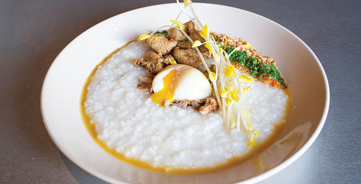 Spoon & Pork features the coddled egg in its umami-rich porridge.