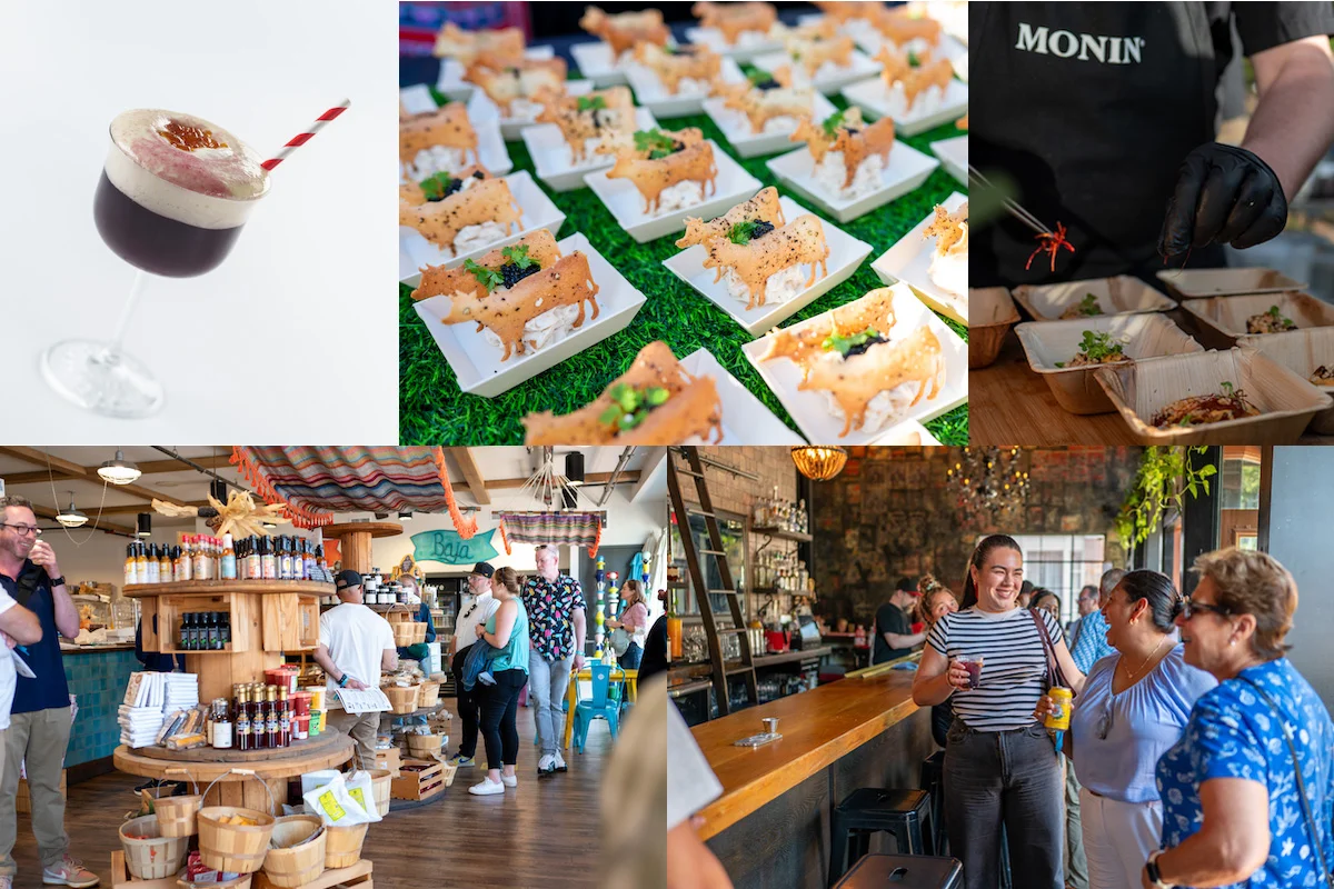Top row, left to right: Showcasing modern beverage trends, Kikkoman impressed attendees with a Blueberry Seltzer & Soymilk Foam with Blueberry Teriyaki Spheres. The California Milk Advisory Board featured Cacio e Pepe Chips and Dip: California Gouda cheese and pepper crisps with a cacio e pepe mousse, garnished with caviar. Chef Jacob Sturm puts the finishing touches on Monin’s Fragrant Cured Pork Belly with Monin Yuzu Pineapple glaze, snap pea and napa cabbage slaw, pork broth-tossed glass noodles and Monin-Racha hot sauce. Bottom row, left to right: On the last day of the event, an off-site excursion brought attendees to nearby Santa Ana, offering a rich local food culture; stops included the vibrant Alta Baja Market and Lola Gaspar cocktail bar and taqueria.