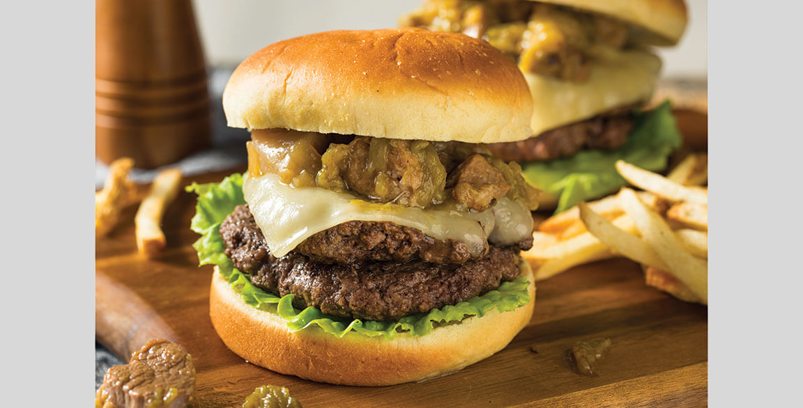 Look to flavorful stews as a way to introduce a premium—and hearty—component in unexpected places. Here, chunks of green chile verde-braised pork serve as a rich protein topper in a satisfying burger build.