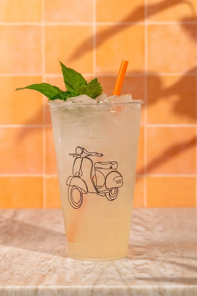 Credit: Piada Italian Street Food Piada features signature flavor combinations in its seasonal beverages, like this summer’s refreshing LTO, the Peach-Basil Fresca, with ripe white peaches, fresh basil, lime and a hint of ginger.