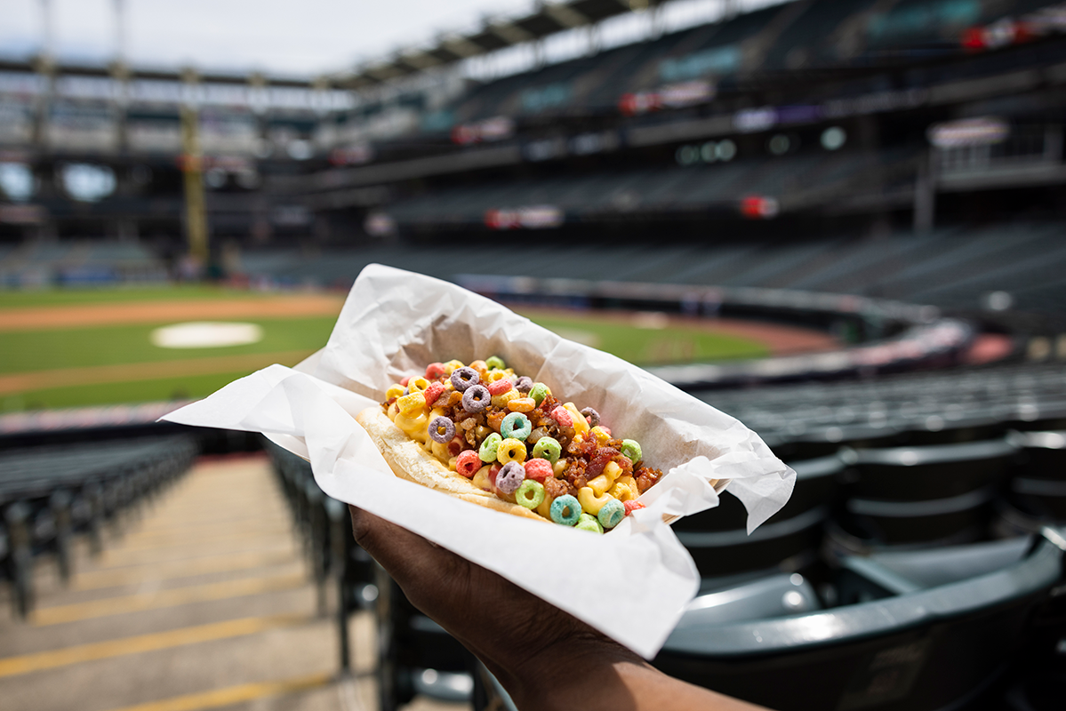 Photo Credit: Progressive Field Progressive Field featured the fun and whimsical Slider Dog from local restaurant Happy Dog, with pimento mac and cheese, bacon and Froot Loops.