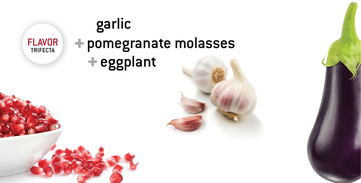 “The pomegranate molasses has a great balance of sweet and sour flavors. It fixes the bitterness of the eggplant and reduces the sharp taste of garlic. The pomegranate also cuts the lusciousness of the eggplant’s texture, and garlic brings a savory punch to the dish.”