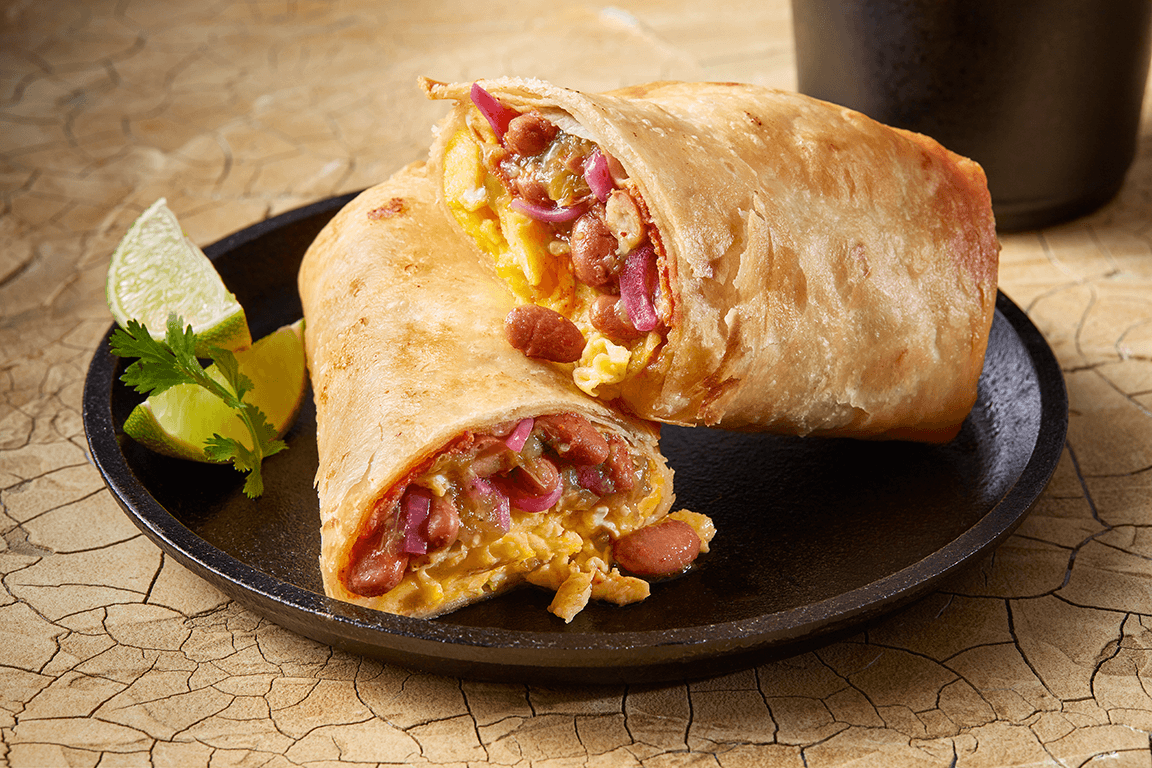- For each burrito, place a flour tortilla on a work surface. Place 3 oz warm scrambled eggs in center of tortilla. Place 2 oz warm ranchero beans on top of eggs. Place ½ oz cheese blend on top of beans. Place 12 chorizo chips across cheese. Place 1 ½ oz Salsa Verde on top of chorizo chips. Place 1 oz Pickled Red Onions on top of salsa verde.