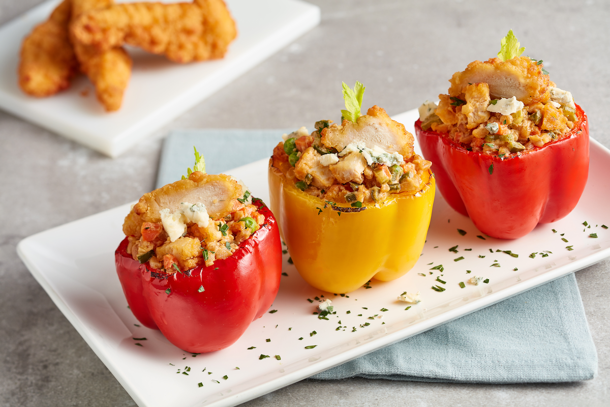 Fried Buffalo Chicken and Farro–Stuffed Peppers