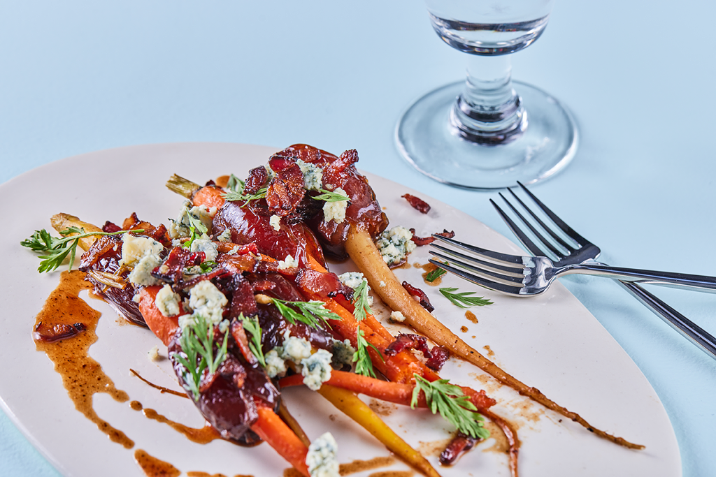 Tristen Epps, Chef/Owner of Epps & Flow Culinary in Miami, showcases a next-level glaze, using bacon fat and date molasses as surprise ingredients. He first renders Smithfield Bacon, cut into lardons, then removes the bacon, leaving the fat in the pan. He wraps al dente carrots in pitted dates, cooking them in the bacon fat and deglazing with sherry vinegar, then adds date molasses, reducing until sticky. When plating, he garnishes the carrots with blue cheese crumbles and finishes with a crack of black pepper.