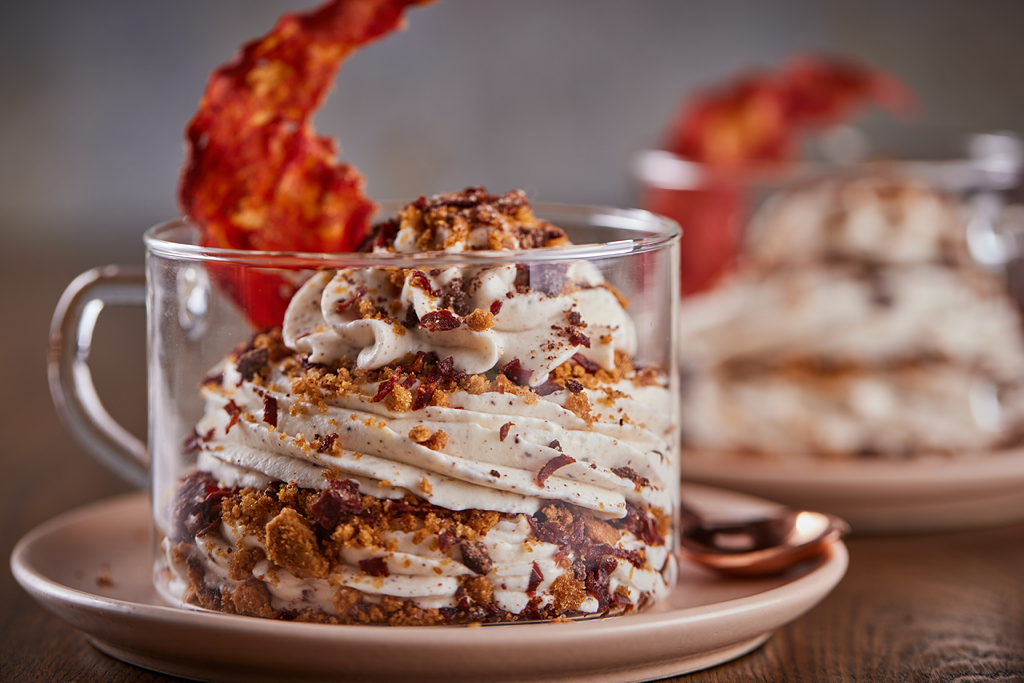 This Mexican Hot Chocolate Mousse with Margherita Capicola showcases the sweet-savory trend, featuring pieces of salty capicola as a savory garnish and balancing the sweetness in a classic graham cracker crust with an umami-rich hit of rendered bacon fat.