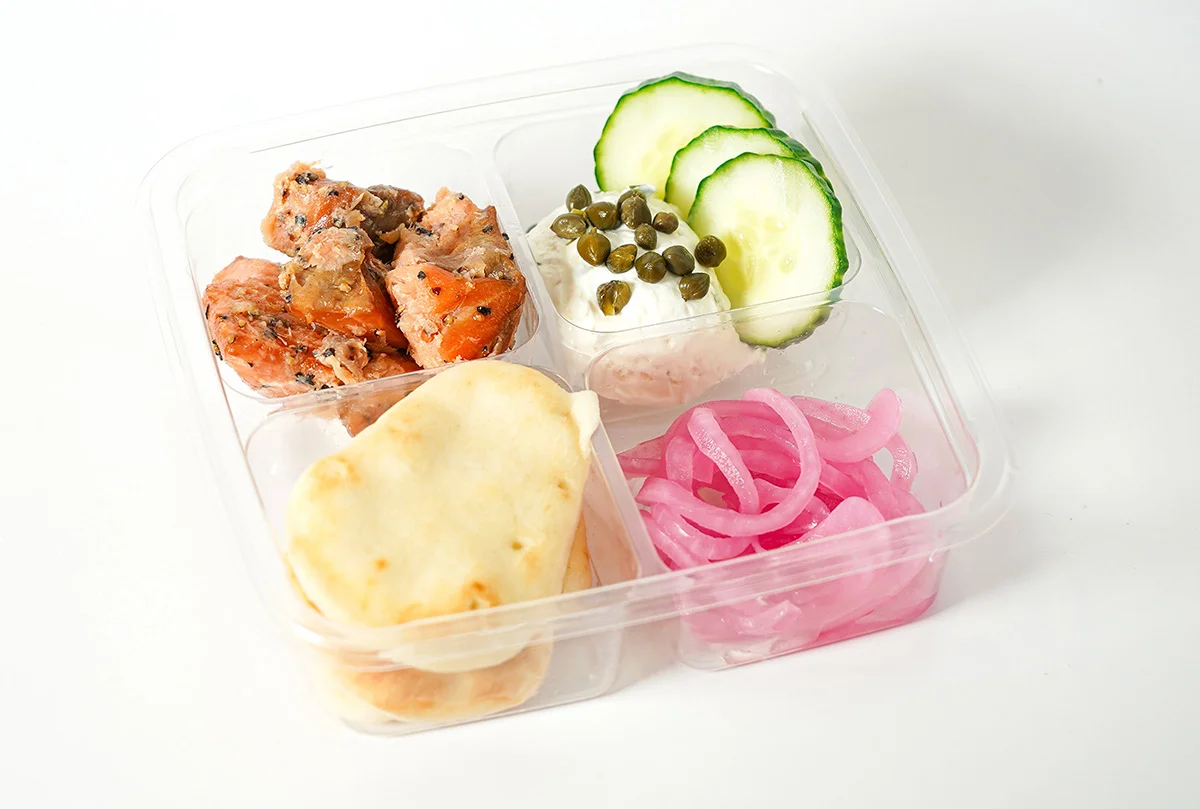 Credit: Kathy Casey Food Studios / Maya Alderman Dish D’Lish at the Sea-Tac Airport in Seattle menus an Alaska Smoked Salmon Snack Pack, pairing pepper-smoked sockeye salmon with a chèvre and chive cream cheese spread, capers, pickled red onions and mini naan, served deconstructed so travelers can build each bite their own way.