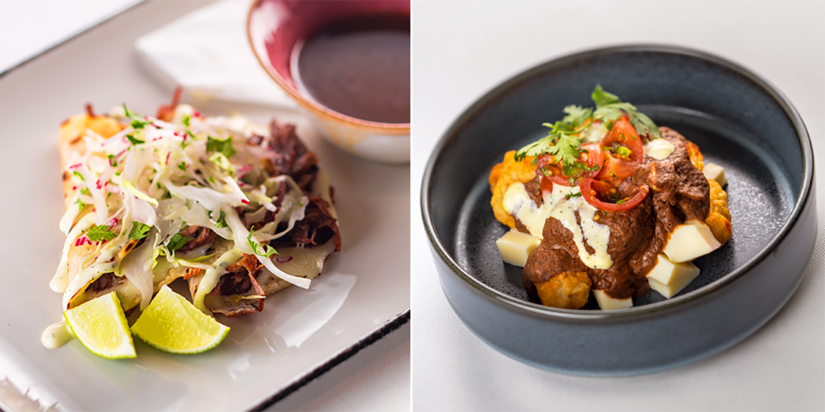 Cal-Mex Quesabirria (left) and Plant Forward Cal-Mex “Poutine” (right) lean into Oaxaca for its sweet, slightly salty flavor, showcasing its menu versatility.