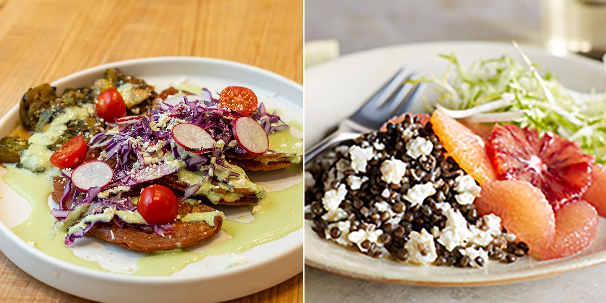 The enduring popularity of queso fresco makes it a natural choice for Mexican menus as well as for modern American concepts. Both the traditional Tres Queso Enchiladas Potosinas (left) and the unconventional Beluga Lentil Salad (right) demonstrate how this cheese can elevate different dishes..