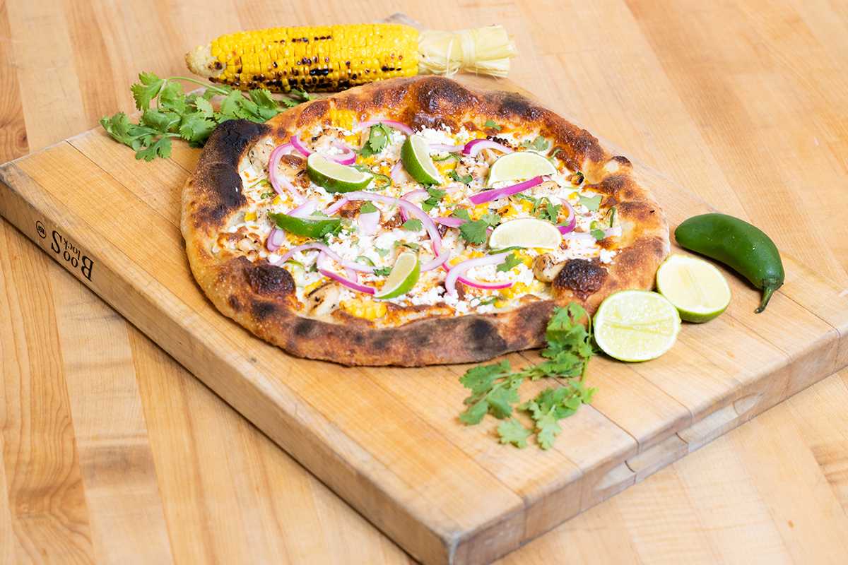 In developing the El Pollo Borracho, “I wanted to create something that would take me back to the fondest memories of my childhood, while incorporating the best of what I’ve learned since I first started making pizza,” says Crawford. “That’s where the Oaxaca and queso fresco cheeses came together for me. Then I added roasted fresh local corn and grilled tequila-lime chicken.” He concedes that considerable trial and error was involved. “I made a lot of versions, testing the flavors and tweaking it until the final version spoke to me.” The award-winning build also features lime-pickled red onions, crème fraiche, Tajin, cilantro and fresh lime wedges to deliver the “right” balance of salt and acid. The pizza has no sauce, so all the ingredients are crispy at service. Righteous Slice adds the El Pollo Borracho to the menu when corn is at peak season.
