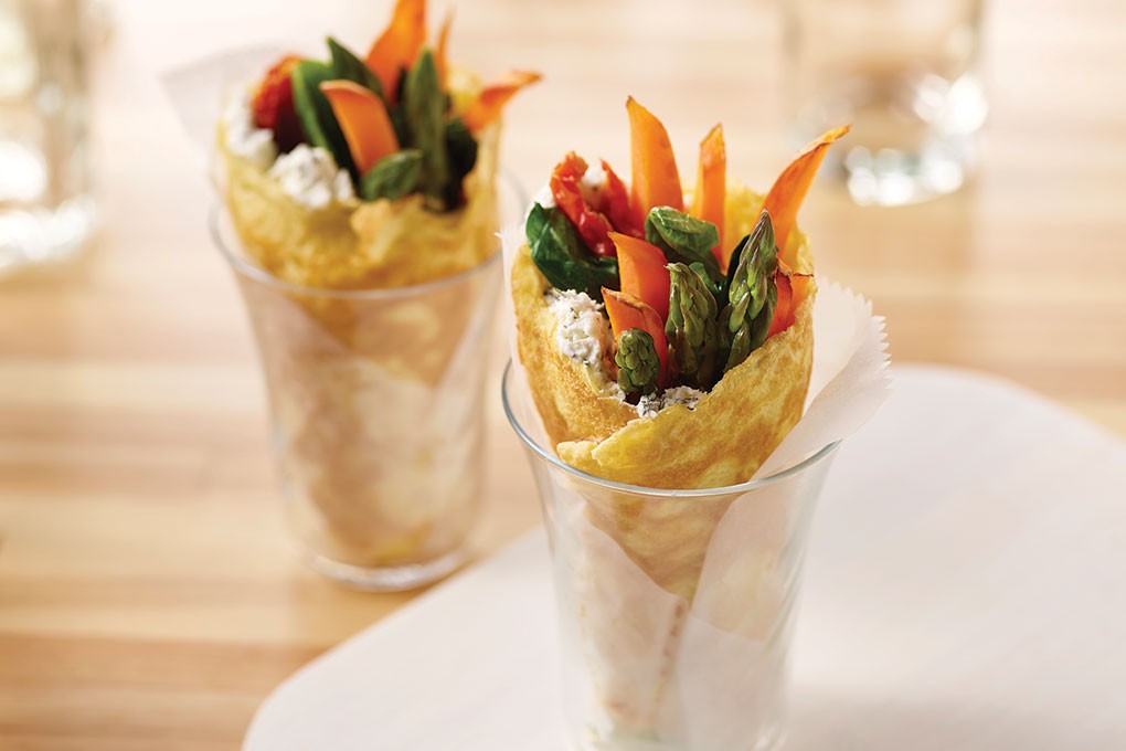 Reimagining the egg as a modern carrier, this Egg Crêpe Cone offers operators a protein-rich and portable format that can carry any number of ingredients, moving easily into global flavor profiles and inviting flavor infusions. Served with a parchment paper wrap to assist in holding the fillings together, the crêpe “batter” simply consists of whisked eggs. This particular version boasts a veg-centric build with wilted spinach, garlic, roasted asparagus and roasted red peppers, along with baked sweet potato sticks and herbed goat cheese.