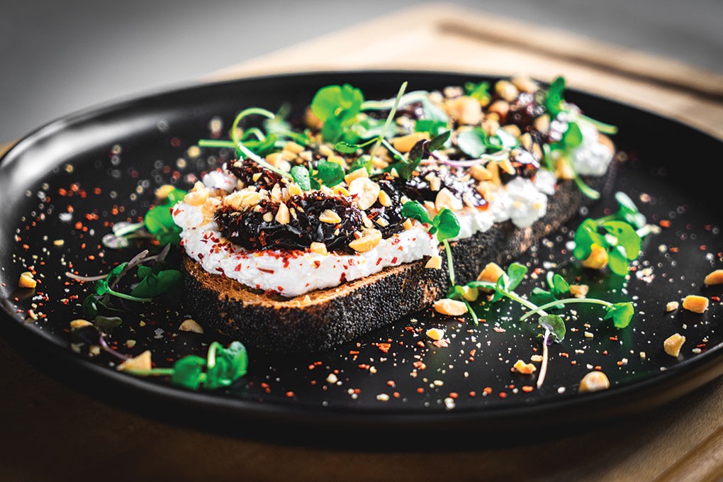 Don’t be fooled by this seemingly simple menu item—this Ricotta Toast with California Prune Jam is a complex flavor build resulting in a decadent and multidimensional handheld option. Here, toast is topped with a creamy ricotta spread and a flavorful California prune jam, prepared with Chinese five-spice along with mirin and umeboshi plum vinegar, which lend elements of sweet, savory and umami. Topped with dry-roasted and salted peanuts, micro basil, Korean chile flakes and Maldon salt, this dish checks a lot of boxes in delivering high-level flavor.
