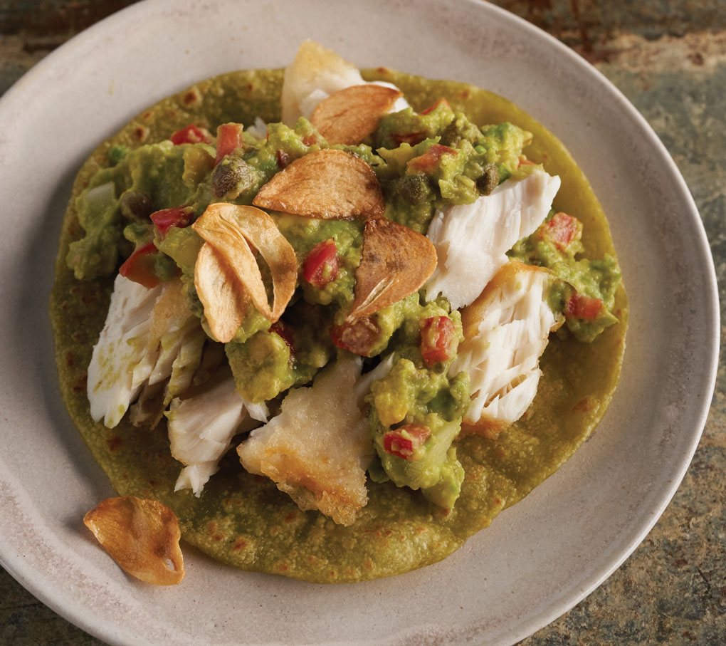 The ubiquitous fish taco is always primed for a flavor upgrade, and this Veracruzana Fish Taco offers just that. A purée of ripe avocado replaces some of the lard in the flour tortilla, while creating a colorful carrier for the fillings: lightly fried red snapper and Veracruz-style guacamole, with tomato, garlic, olives, capers and herbs.